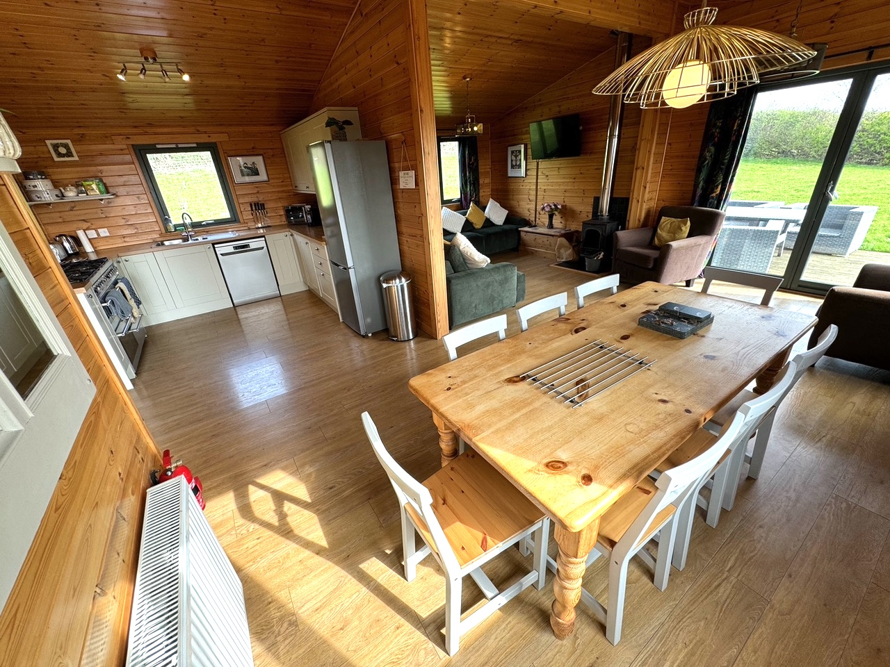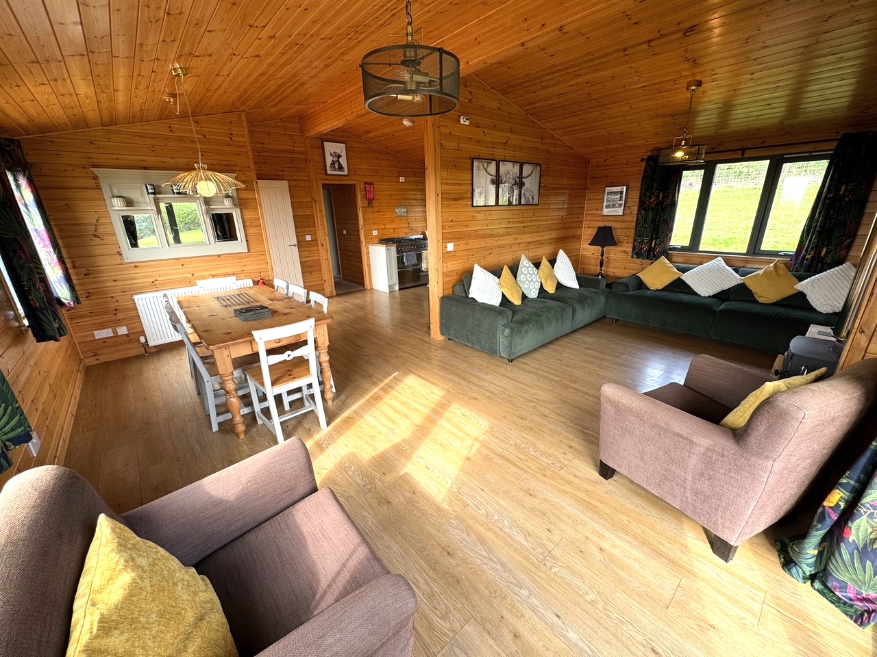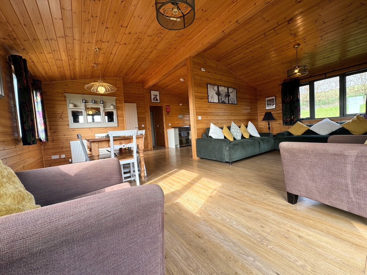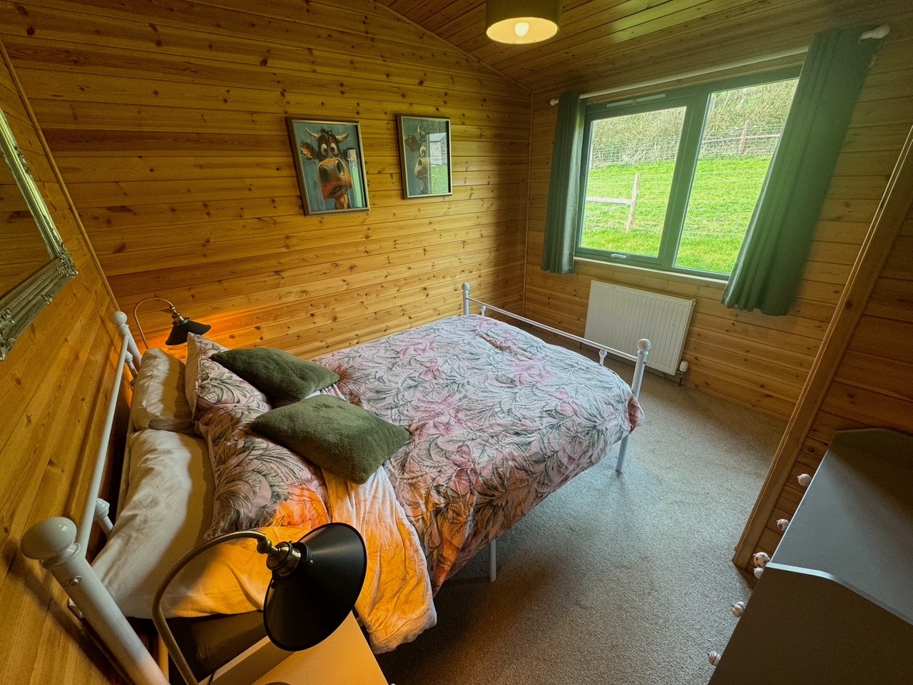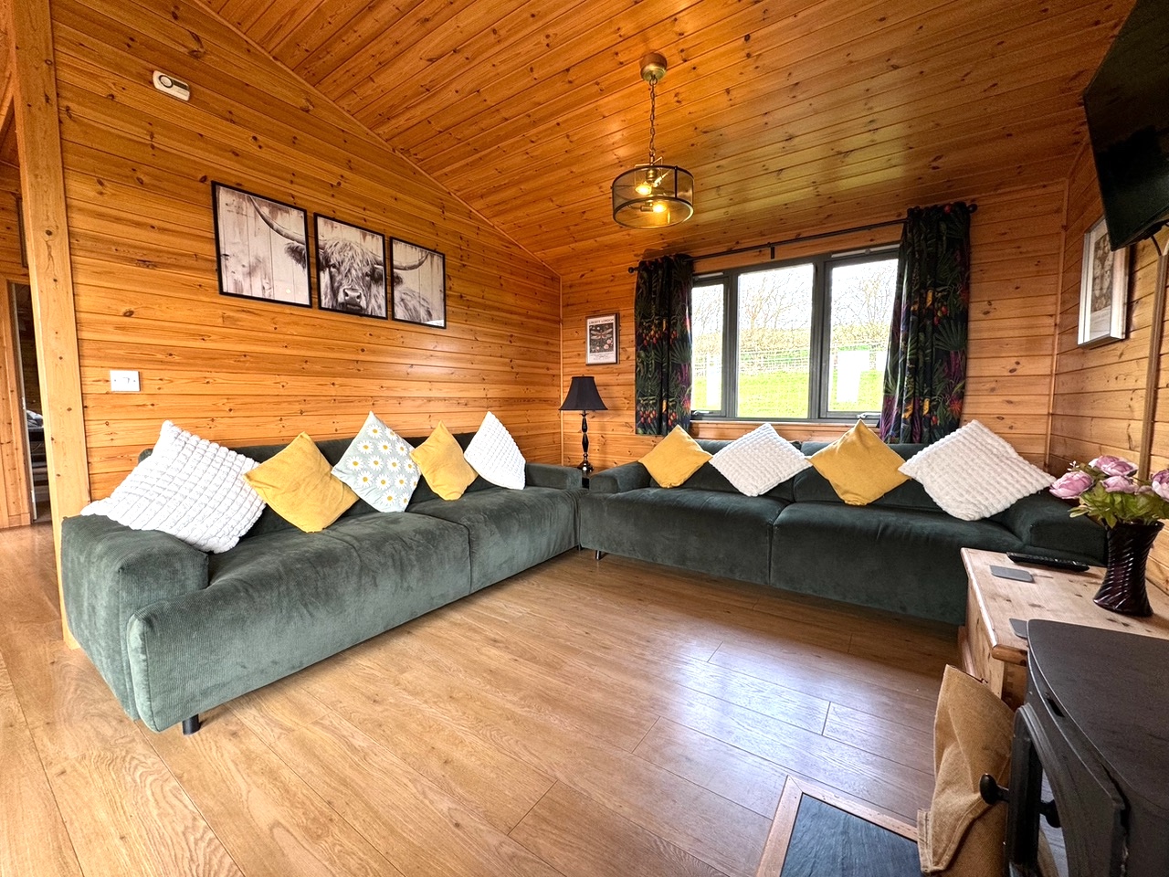 This lovely wooden lodge enjoys a cosy log burner for those chillier evenings, and a well-equipped kitchen perfect for rustling up a celebratory meal. It’s a quiet and peaceful area with sheep and cattle as your neighbours, and depending on the time of year you’ll see the lambs in the adjacent paddock. Use of the paddock for exercising dogs can be agreed with the owner on prior arrangement, as sometimes it can be used for livestock.